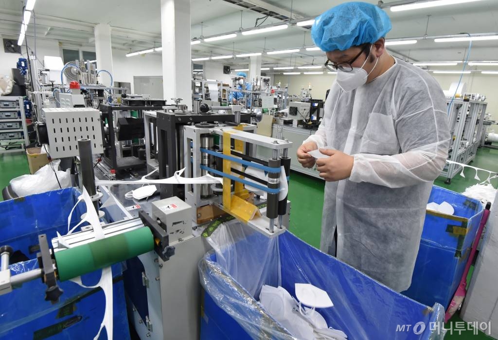 ![[용인=뉴시스] 김종택 기자 = 마스크 5부제가 본격적으로 시행된 9일 오후 경기 용인시 기흥구 상공양행 마스크 공장에서 직원들이 마스크를 검수하고 있다. 정부는 이날 원자재 상승 등으로 어려움을 겪고 있는 생산업체를 지원하고 생산능력을 제고하기 위해 주말(공휴일 포함)·야간 생산실적 등에 따라 매입가격도 추가 인상하는 생산유인제도를 시행했다. 2020.03.09. semail3778@naver.com](https://thumb.mt.co.kr/cdn-cgi/image/f=avif/21/2020/03/2020030915152161993_1.jpg)