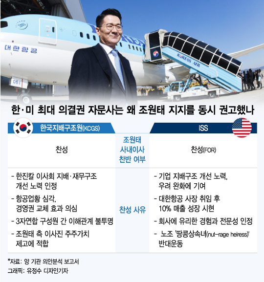 ISS 뿐 아니다. 지난 13일엔 국민연금의 최대 의결권 자문사 한국기업지배구조원(KCGS)도 '조원태 찬성' 권고를 내놨다. 경영권 분쟁 상대방인 조현아 전 대한항공 부사장 3자연합(조현아·KCGI·반도건설) 측 이사후보에 대해선 '불행사'를 권고했다.