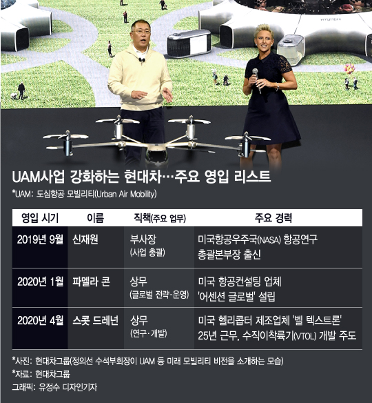 지난 1월15일에는 UAM 관련 전략을 전담할 임원도 영입했다. 미국 항공컨설팅 업체인 '어센션 글로벌'의 설립자 파멜라 콘이 그 주인공이다. UAM 글로벌 전략·운영 담당 상무로 임명된 콘 상무는 현대차 UAM 분야의 상업화 및 규제·정책을 다루고 있다.