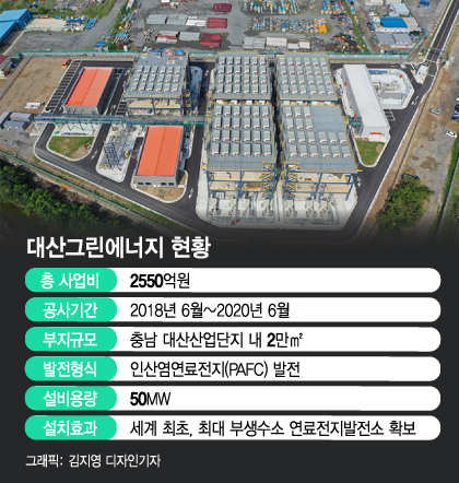 한화에너지는 이 같은 부생수소 발전의 가능성에 일찌감치 눈 떴다. 결정적으로 한화토탈이 아로마틱 설비를 증설한 2016년에 엄청난 부생수소가 나온다는 것을 알게 됐고, 이를 수소 연료전지에 활용한 발전소 사업을 추진했다. 미국 같은 에너지 강국도 그냥 하늘로 날려버리거나 연료에 섞어 태우던 수소였다. 대산그린에너지의 이 수소 연료전지 발전소에 '세계 최초'와 동시에 '세계 최대'라는 수식어가 붙는 이유다.