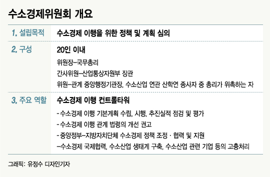 이 위원회는 실제로 △수소경제 제도와 수소 수급계획 수립은 물론 △재원 조달 △기반 조성 △안전관리 등을 포괄하는 수소경제 이행 기본계획을 다룬다. 이 과정에서 중앙정부와 지방정부의 정책 조정, 국제협력, 수소산업 생태계 구축도 진두 지휘한다.