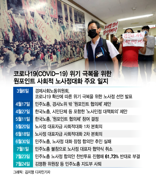 민주노총은 지난 23일 22년 만의 노사정 합의안을 반대하기로 최종 결정했다. 민주노총이 노사정 합의안 추인 여부를 두고 온라인 투표를 실시한 결과 1311명의 표결 인원 중 805명(61.73%)이 반대했다.
