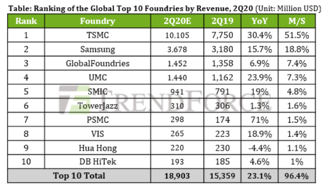 TSMC는 올 2분기 매출이 3107억대만달러(약 12조5000억원)로 삼성 파운드리를 크게 앞지른다. 트렌드포스가 지난달 발표한 올 2분기 전세계 파운드리 점유율은 TSMC가 51.5%, 삼성이 18.8%다. 트렌드포스는 삼성의 2분기 파운드리 매출을 실제보다 높은 36억7800만달러(약 4조3000억원)로 추정했단 점에서 실제 양사의 점유율 격차는 더 큰 것으로 분석된다.