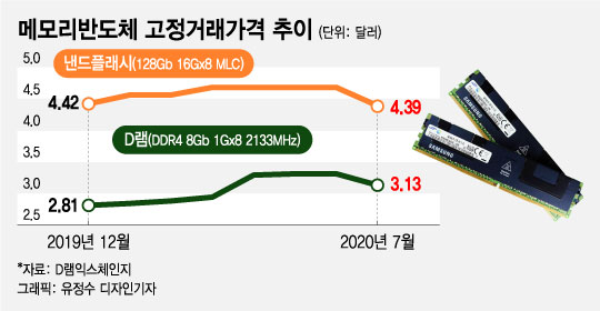 PC에 많이 쓰이는 DDR4 8Gb D램의 고정거래가격도 지난달 평균 3.13달러로 전달(3.31달러)보다 5.4% 하락했다. 낸드플래시 고정거래가격도 128Gb 메모리카드·USB향 범용 제품 기준으로 지난달 평균 4.39달러로 전달보다 6.2% 떨어졌다. 올 들어 이들 제품 가격이 하락한 것은 처음이다.