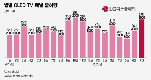 20일 글로벌 시장조사업체 옴디아에 따르면, LG디스플레이의 7월 OLED TV 패널 출하량은 37만3000대로 올 들어 최고치를 보였다. 전달 대비 40%, 지난해 같은 달 대비 50% 증가한 수치다. 이 같은 증가율은 광저우 공장이 본격 양산체제에 돌입했기 때문이다.