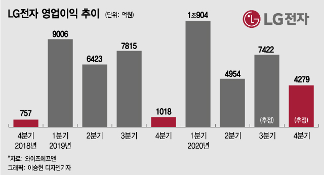 업계 관계자는 "4분기는 11월 말 미국 추수감사절 연휴부터 블랙프라이데이, 크리스마스까지 전세계 유통가 대형 프로모션이 이어지는데 팔수록 수익성이 떨어지는 경우도 많다"며 "LG전자는 이익이 전제된 매출을 목표로 하기 때문에 출혈 경쟁에 동참하지 않아 4분기 매출이 낮은 측면도 있었다"고 설명했다.