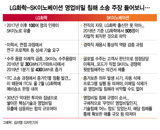 지난해 4월말,LG화학(337,000원 ▲2,500 +0.75%)은 미국 ITC(국제무역위원회)와 댈라웨어 지방법원에 SK이노베이션을 제소하며 그 이유를 이렇게 밝혔다. 전기차용 배터리(2차전지) 핵심 인력 쟁탈전에서 벌어진 갈등을 국제 소송으로 확대하게 된 이유를 '영업비밀 침해' 때문이라고 못 박은 것이다.
