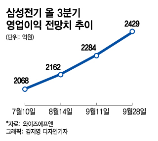 삼성전기의 3분기 영업이익 전망치는 지난 두 달간 지속 상승했다. 지난 7월 초 2000억원 수준에서 현재 400억원 가까이 올랐다. 최근 보고서를 낸 일부 증권사는 3분기 영업이익을 2700억원 이상으로 상향조정했다.