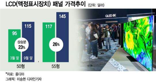 시장조사업체 옴디아에 따르면 50형 LCD 패널 가격은 올 3월 말 95달러에서 지난달 말 117달러로 23% 수직 상승했다. 55인치도 같은 기간 115달러에서 145달러로 가격이 26%나 올랐다. 코로나19로 주춤했던 소비도 재택 시간이 늘면서 대형 TV 중심으로 잘 팔리기 시작했다.