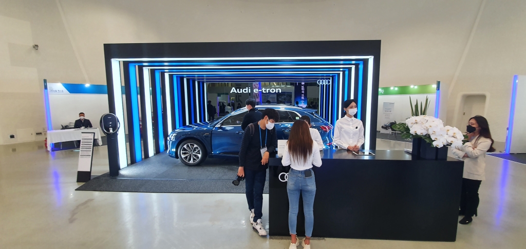 28일 서울 동대문 디자인플라자(DDP)에서 개막한 '2020 그린뉴딜 엑스포'의 '그린모빌리티 존'에는 아우디를 비롯해 메르세데스-벤츠, BMW, 르노삼성, 쉐보레가 개별 부스를 열고 관람객들을 맞이했다. 아우디 e트론과 더불어 벤츠 EQC, BMW 뉴330e, 르노삼성 트위지, 쉐보레 볼트EV가 부스별로 전시돼 참석자들의 발걸음을 끌었다.