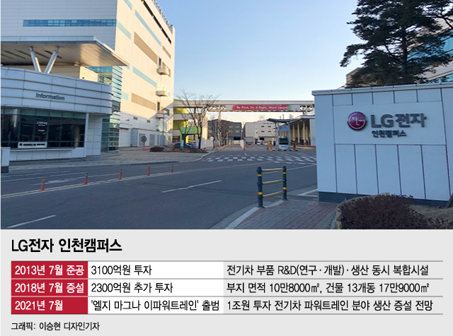 최근 수년 새 글로벌 완성차 업체들이 너도나도 전기차 양산에 나서자 LG전자는 2018년 7월 인천캠퍼스에 2300억원을 추가 투자해 생산라인 연면적을 10만8000㎡에서 17만9000㎡로 65% 증설했다. 오는 7월 출범을 앞둔 LG전자와 세계 3위 자동차 부품업체인 캐나다 마그나의 합작법인 '엘지 마그나 이파워트레인'도 바로 이곳에 둥지를 튼다.