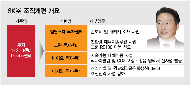 SK㈜는 24일 투자 포트폴리오를 4대 핵심 사업 중심으로 재편하고 기존 센터 조직의 명칭을 △첨단소재 투자센터 △그린 투자센터 △바이오 투자센터 △디지털 투자센터로 변경한다고 밝혔다. 이를 통해 미래 성장성이 좋은 포트폴리오를 보유하고 영역별로 다양한 파트너들과 함께 성장할 수 있는 투자 생태계 조성을 추진한다는 계획이다.