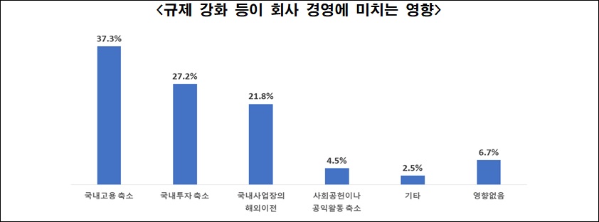 구체적으로 지난해말 국회를 통과한 기업규제3법과 산업별 규제가 회사경영에 어떤 영향을 줄 것인가는 질문에 국내고용이 축소될 것이란 대답은 37.3%를 차지했다. 이밖에 국내투자 축소(27.2%), 국내사업장(공장 및 법인)의 해외이전(21.8%) 등을 고려한다고 답하는 등 86.3%가 부정적인 인식을 보였다.