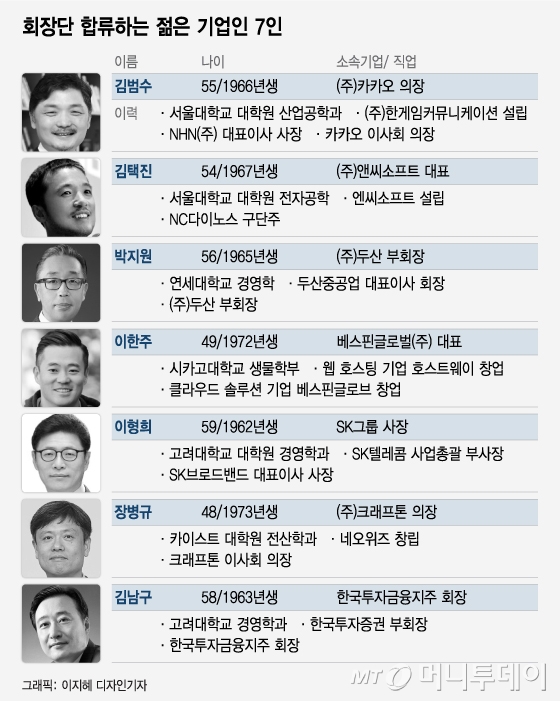 최 회장이 영입한 부회장단의 면면에서도 세대교체의 분위기가 짙게 풍긴다. 김범수 카카오 의장(1966년생)과 김택진 엔씨소프트 대표(1967년생), 이한주 베스핀글로벌 대표(1972년생), 장병규 크래프톤 의장(1973년생) 등 2000년대 들어 급성장한 인터넷·게임 분야의 신산업 주자들이 영입됐다.