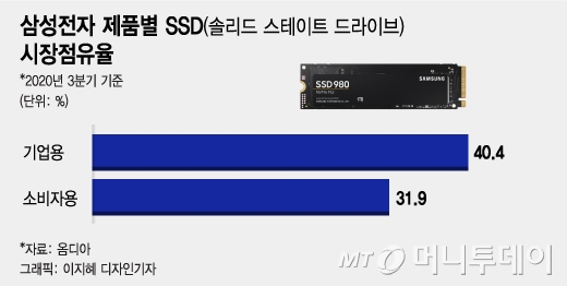 제품별로 삼성전자는 기업용 SSD 시장에서 점유율 40.4%, 소비자용 시장에서 31.9%를 차지한다. 반도체업계 한 인사는 "삼성전자가 가성비에 초점을 맞춘 고성능 소비자용 SSD를 출시한 것은 상대적으로 점유율이 낮은 소비자용 시장에도 공을 들이겠다는 것"이라고 분석했다.