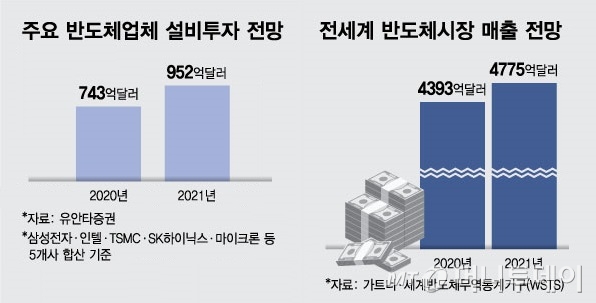 유안타증권에 따르면 인텔, 삼성전자, TSMC, SK하이닉스, 마이크론 등 5개사의 올해 설비투자는 사상 최대치인 952억달러(약 106조2400억원)로 지난해(743억달러)보다 30% 늘어날 것으로 예상된다.