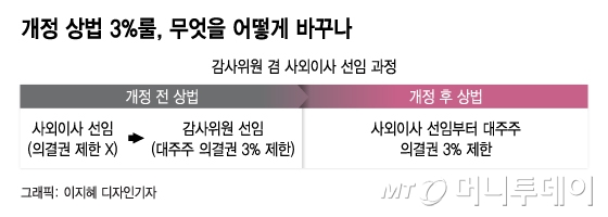 개정 전 상법에서는 감사위원을 사외이사 중에서 뽑고 사외이사를 선임할 때는 대주주 등의 의결권을 제한하지 않기 때문에 감사위원을 선임할 때 대주주 등의 의결권을 3%로 제한하더라도 이사회에서 추천한 사외이사 겸 감사위원 후보가 대체로 무난하게 선임됐다.