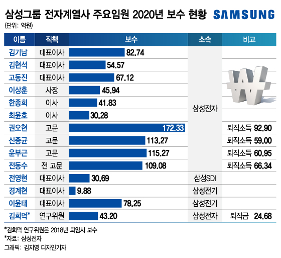 삼성전자 임원들의 고액 퇴직금은 최근 공개된 지난해 사업보고서에서도 다시 회자됐다. 총수 일가를 제외한 '삼성맨'으로는 두번째로 회장을 지냈던 권오현 고문이 지난해 퇴임하면서 퇴직금으로만 92억9000만원을 지급받았다.
