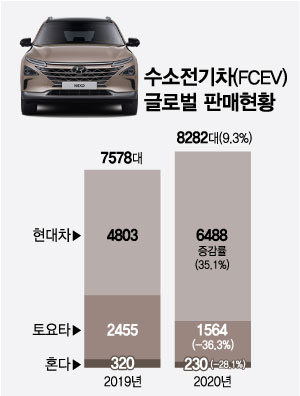 수소전기차는 '넥쏘'가 일본 토요타 '미라이'를 밀어내고 글로벌 수소전기차 시장을 80% 가까이 장악하며 독보적 존재감을 과시했다. 현재 수소전기차를 양산해 판매하는 글로벌 완성차업체는 현대차와 일본 토요타·혼다(클래리티) 뿐이다.