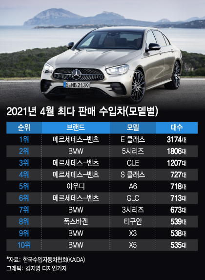 한편 지난달 돌풍을 일으켰던 테슬라는 순위권 밖으로 밀려났다. 카이즈유 데이터 연구소에 따르면 올해 3월 3194대로 수입차 중 세 번째로 가장 많이 팔렸던 테슬라는 4월 입항물량이 소진돼 76대 판매에 그쳤다.