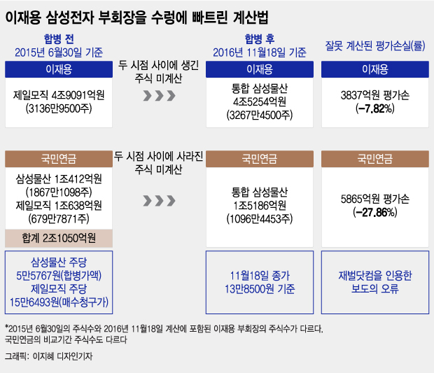 당시 재벌닷컴의 자료를 인용한 언론사는 합병 전과 후의 자산평가손익을 계산하면서 국민연금은 보유 주식을 판 이후 남은 주식가치(매도 금액은 제외)로, 이 부회장은 보유주식에 합병 후 추가로 매입해 늘어난 가치(매입 금액은 포함)로 수익률을 비교했다.