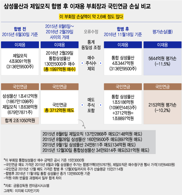 반면 국민연금은 합병전 2015년 6월 30일 기준으로 삼성물산 1조 412억원, 제일모직 1조 638억원 등 총 2조 1050억원 어치를 보유하고 있었다. 국민연금은 평가손익 보도가 나온 시점인 2016년 11월 20일 이전에 총 3712억원 어치(총 357만여주)의 삼성물산(185만 311주), 제일모직(137만2868주), 통합 삼성물산(34만9314주) 주식을 팔았다.