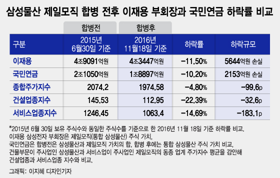 통합삼성물산 주가가 하락하는 기간 종합주가지수는 4.8%, 삼성물산 건설부문과 관련이 높은 건설업종지수는 22.39%, 삼성물산 서비스 부문과 관련이 깊은 서비스업종 지수는 14.69% 각각 하락했다. 당시 국민연금이 보유한 통합 삼성물산의 주가하락분은 업종 평균 하락률보다 덜했던 셈이다.