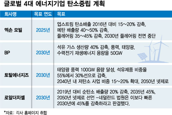 한 때 전세계 시총 1위였던 엑손 모빌의 대런 우즈 회장은 지난해 말 탄소중립 선언에 나서면서 "우리는 2050년까지 탄소배출 넷제로를 달성하려는 사회의 열망을 존중하고 지원하며, 기후 변화의 위험을 해결하기 위해 비용 효율적인 시장 기반 솔루션을 장려하는 정책을 계속 지지할 것"이라고 밝혔다.
