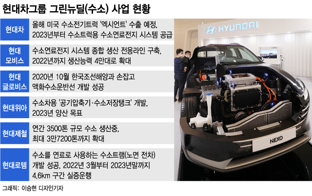 같은 날 한국에선 그룹 차원의 수소사회 비전 선포식을 개최한다. 전 세계를 대상으로 온라인 생중계되는 이 행사에서도 현대차·기아(155,600원 ▲3,000 +1.97%), 현대모비스(447,000원 ▲14,500 +3.35%), 현대위아(86,700원 ▲1,900 +2.24%), 현대로템(244,500원 ▲13,500 +5.84%), 현대제철(44,100원 ▲550 +1.26%) 등 그룹 내 핵심계열사의 수소 관련 기술과 역량을 종합적으로 보여주고 미래 수소사회 비전을 제시한다. 이미 양산이 시작된 수소전기차와 수소트럭·버스 외에도 처음 공개되는 수소 관련 제품이 대거 등장할 것으로 전해졌다.