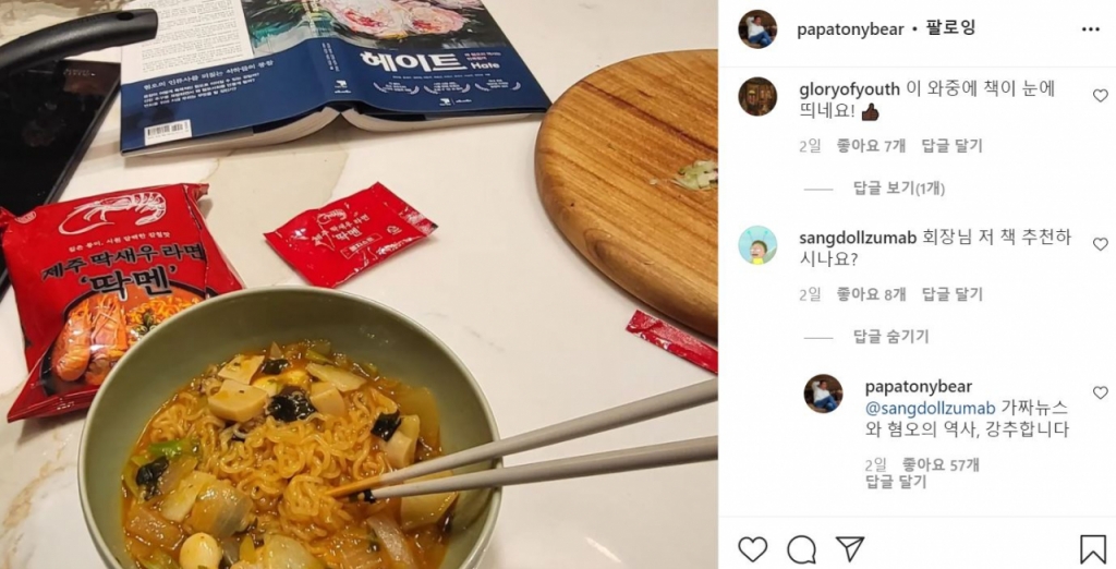 지난 2일, 최태원 SK그룹 회장이 자신의 인스타그램에 올린 사진 한장에 달린 댓글에 직접 답한 내용이다. 이 사진 속엔 맛있게 끓여놓은 라면 한 그릇을 배경으로 '헤이트'란 제목의 책 한권이 담겼는데, 한 팔로워가 "회장님 저 책 추천하시나요?"라고 묻자 그가 이렇게 적은 것이다.