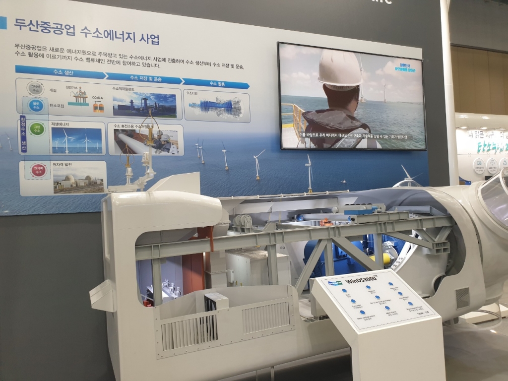 두산그룹은 풍력발전부터 수소사업까지 아우르는 광범위한 신재생에너지 사업을 벌이고 있다. 이날 전시에서 두산 그룹은 3MW(메가와트)급 풍력발전기와 10kW 건물용 고체산화물연료전지(SOFC), 수소·전기·열을 동시에 생산할 수 있는 '트라이젠' 등을 중점적으로 선보였다.