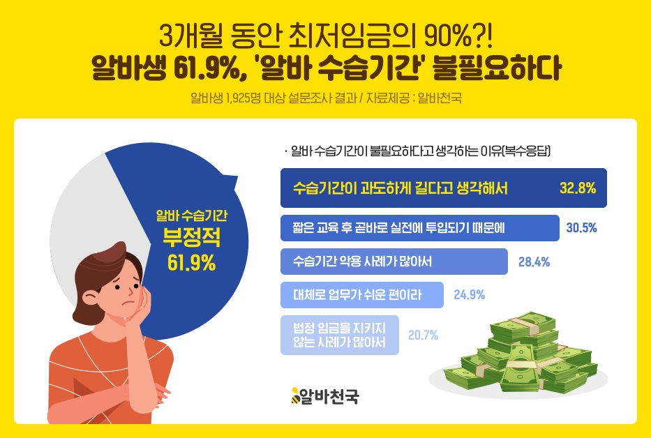 구인구직 아르바이트 전문 포털 알바천국은 아르바이트(단기근로)를 경험했거나 근무 중인 1925명을 대상으로 '수습기간 필요성'에 대한 설문조사에서 불필요하다는 응답이 61.9%라고 8일 밝혔다. 최저임금법에 따라 근로계약 후 3개월 까지 수습기간을 두고, 10%를 감액해 지급할 수 있다. 최근 고용노동부는 편의점 아르바이트 등 수습기간 적용 예외대상자에 대한 실태파악에 나섰다.