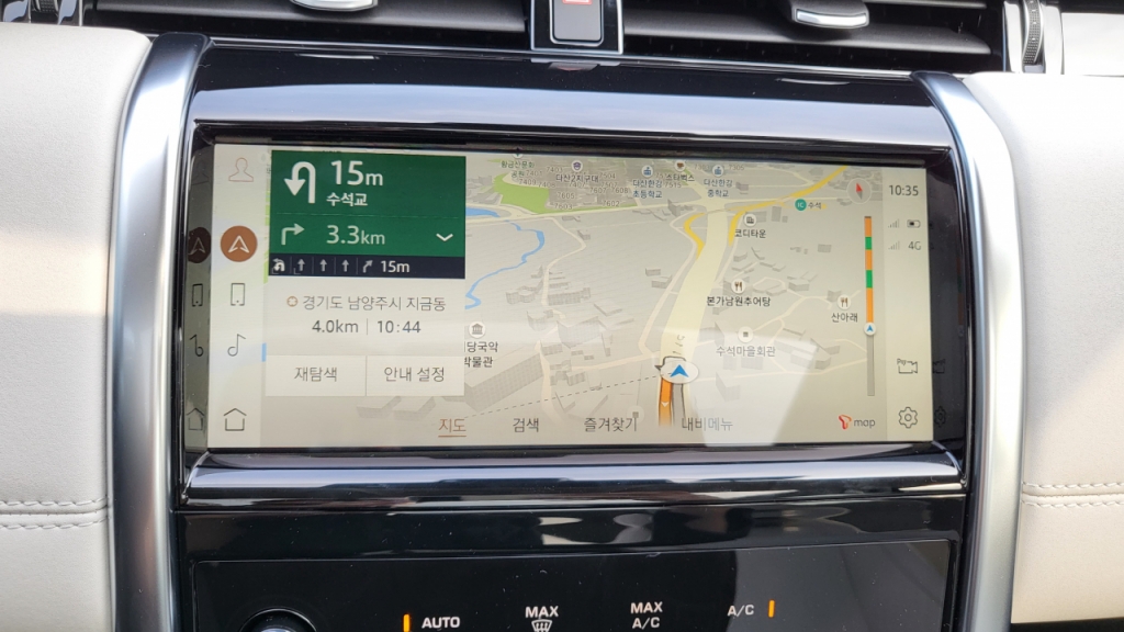 디스커버리 스포츠를 탈 때는 T맵이 기본으로 내장돼 외투에서 스마트폰을 꺼내 충전기를 연결하고 목적지를 검색하는 단계가 모두 건너뛸 수 있었다. 내장 T맵에 T아이디를 로그인해두면 스마트폰 앱 상에 있는 '자주 찾는 목적지', '즐겨찾기' 등이 연동된다.