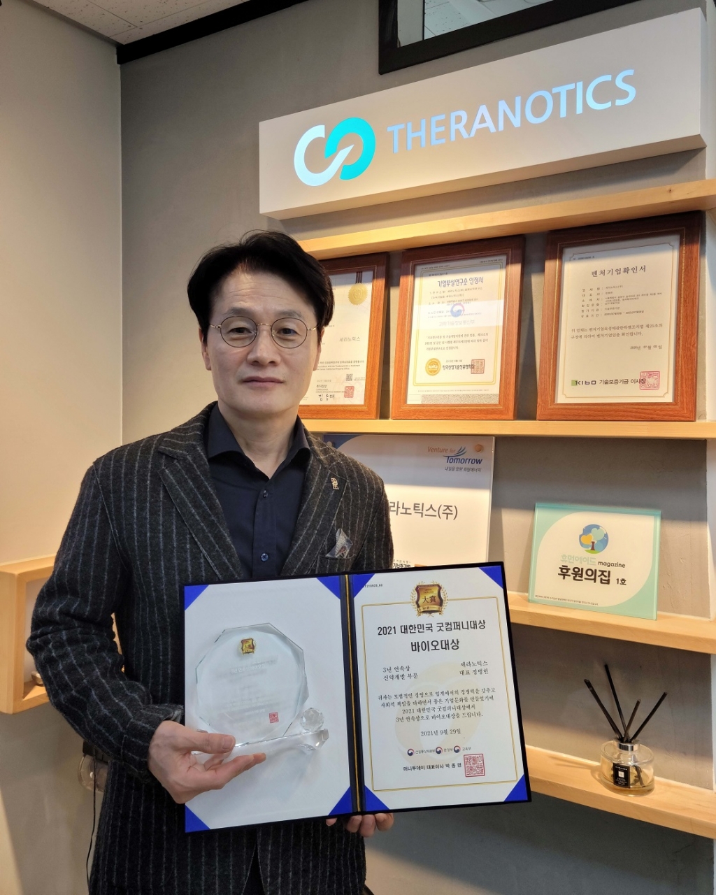 정병헌 세라노틱스 대표가 머니투데이 주최의 '2021 제7회 대한민국 굿컴퍼니대상'에서 '3년 연속상'으로 '신약개발' 부문 '바이오대상'을 수상하고 기념사진을 촬영 중이다.