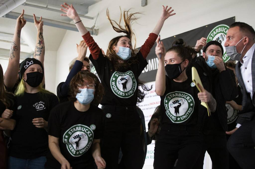 ![[버펄로=AP/뉴시스] 9일(현지시간) 미 뉴욕주 버펄로의 한 스타벅스 매장에서 이곳 직원들과 지지자들이 노조 결성 찬반 투표 가결에 환호하고 있다. 이 매장 직원들은 찬성 19, 반대 8로 노조 결성 투표를 가결해 50년간 무노조 경영을 해 온 미국 내 스타벅스 매장 최초로 노조가 생기게 됐다. 이에 따라 미국 내 타 매장에서도 노조가 결성될 가능성이 커지고 있다. 2021.12.10.](https://thumb.mt.co.kr/cdn-cgi/image/f=avif/21/2021/12/2021121309261512101_1.jpg)