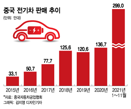 이유는 간단하다. 올해 중국 전기차 판매량이 급증했기 때문이다. 올해 1~11월 중국 전기차 판매대수는 전년 대비 167% 증가한 299만대에 달했으며 11월 한 달에만 45만대가 팔렸다. 중국 전기차 통계는 순수전기차(BEV), 플러그인 하이브리드(PHEV)를 포함한 개념으로 약 82%가 순수전기차다.