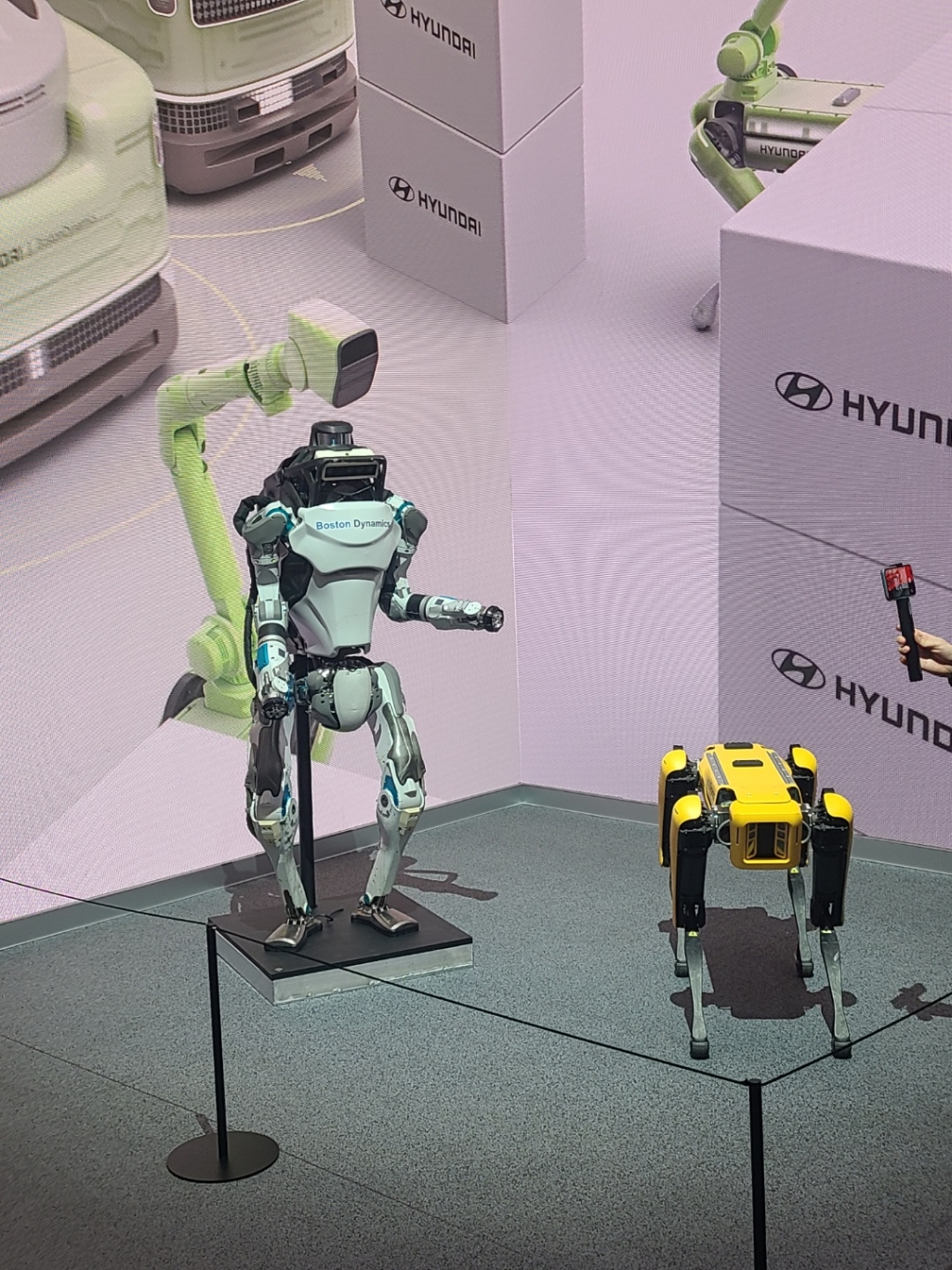 이들은 기다리는 부스 내 전시물은 자동차가 아닌 로봇이다. 현장에는 현대차가 인수한 보스턴 다이내믹스의 서비스형 로봇 '스팟'과 지능형 로봇 '아틀라스', 그리고 현대차가 개발한 퍼스널·서비스·로지스틱스 모빌리티, 모베드 등 로봇 형태의 모빌리티만 자리를 전시됐다.