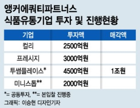 앵커PE의 식품유통기업 관심은 2018년 CJ푸드빌로부터 투썸플레이스를 인수하면서 주목을 받았다. 당시 캐나다연금투자위원회, 싱가포르투자청 등과 4500억원에 사들인 뒤 2년만에 칼라일그룹에 1조원에 매각하면서 대박을 냈다. 그동안 앵커PE가 1조원 이상을 거둬들인 것은 의약품 유통업체 지오영 매각 이후 두번째다.