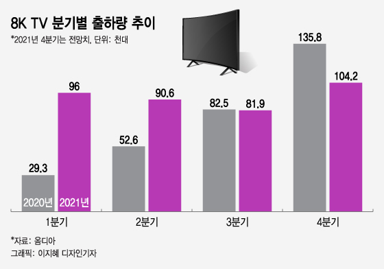 10일 시장조사업체 옴디아에 따르면 지난해 4분기 8K TV 출하량은 10만4200대로 전망된다. 직전 분기인 3분기 8만1900대 보다 늘어 세 분기 연속 이어졌던 직전 분기 대비 역성장은 멈췄다. 하지만 4분기 연말 특수 덕분으로 전년 동기(13만5800대) 대비로는 24%가량 줄었다.