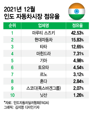 현대자동차그룹의 인도 자동차 시장 내 높은 영향력도 한국 배터리 기업 유치를 적극 희망하는 배경으로 풀이된다. 현대차는 1998년 인도 첸나이에 공장을 짓고 현지 공략을 본격화했다. 인도자동차딜러협회(FADA)에 따르면 지난해 12월 현대차는 인도 토종업체인 마루티스즈키(42.53%)에 이어 15.83%의 점유율로 인도 자동차 업계 2위에 올랐다. 기아도 4.98%의 점유율로 토요타·르노·혼다 등을 제치고 5위에 랭크됐다. 현대자동차그룹은 지난해 12월 2028년까지 400억루피(약 6200억원)를 투자해 인도에서 전기차 6종을 출시할 계획이라고 공개했다.