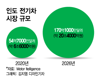인도는 이륜차를 포함한 완성차 시장에서 판매 대수 기준으로 세계 4위이자, 생산 기준 세계 5위 권이다. 자동차 시장분석기관 모터 인텔리전스에 따르면 인도 전기차 시장 규모는 2020년 54억7000만달러(약 6조6000억원)에서 2026년 170억1000만달러(약 20조4000억원)로 확대될 것으로 예상된다. 2030년에는 인도에서 생산되는 전체 차량의 20%가 전기차가 될 것으로 분석됐다.