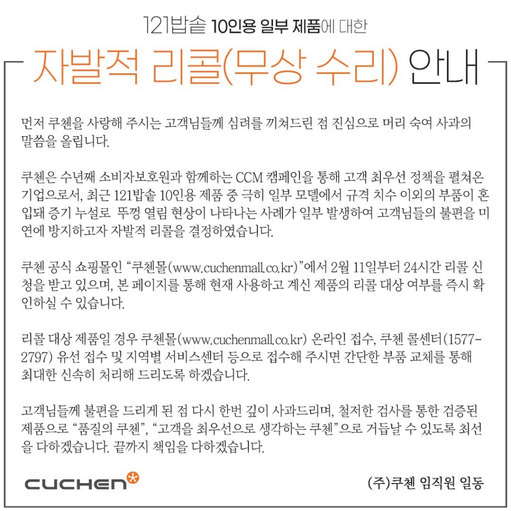 쿠첸이 오는 11일부터 '121 밥솥' 10인용 일부 제품에 대해 자발적 리콜(무상수리)을 실시한다고 10일 밝혔다.