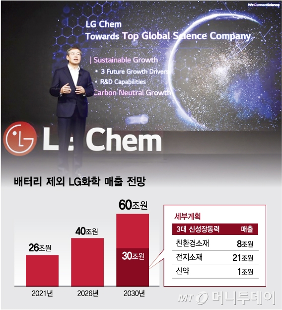 LG화학에 좀더 초점을 맞추면 자회사로 분리된 LG엔솔 상장 과정에서 기존 지분을 처분해 확보한 자금이 2조5000억원에 달한다. LG화학은 지난해 7월 발표한 신재생에너지, 전지소재, 신약 등 3대 신성장동력 분야에 2025년까지 10조원을 투자한다는 계획이다. 배터리사업을 걷어낸 매출 목표가 지난해 26조원에서 2026년 40조원, 2030년 60조원 규모다. LG화학은 지난 8일 실적 발표에서 2030년 매출 목표 60조원 가운데 3대 신성장 분야에서만 30조원을 올리겠다고 밝혔다.