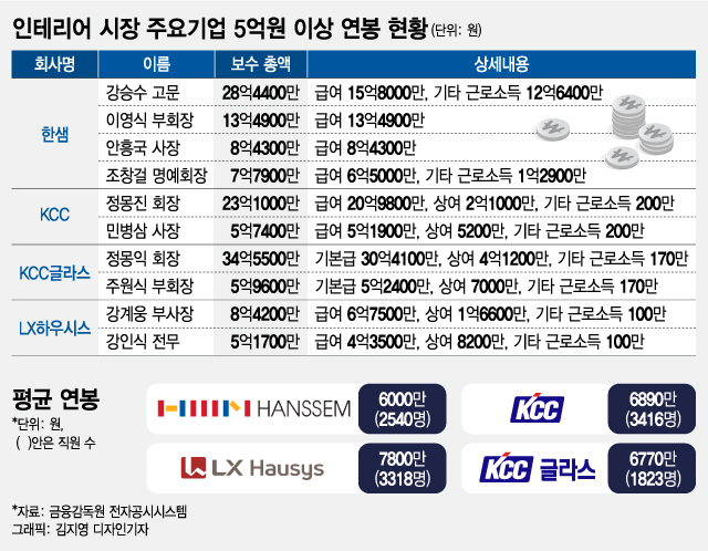 한편 인테리어 주요업체들 평균임금은 LX하우시스가 7800만원(직원수 3318명)으로 가장 높았다. KCC가 6890만원(3416명), KCC글라스가 6770만원(1823명)으로 뒤를 이었다. 한샘이 6000만원(2540명)으로 가장 낮았다.