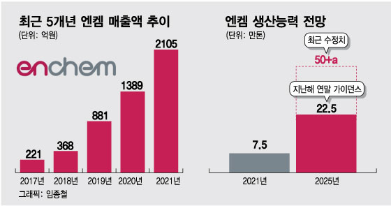 지난해 말 예상했던 2025년 기준 생산능력 전망치는 약 22만5000톤이었지만 최근 내부적으로 이 전망치를 50만톤으로 두 배 이상 높이는 방안도 검토중인 것으로 파악됐다. 지난해 엔켐의 생산능력이 7만5000톤이었던 점에 비춰보면 4년 내 6배 이상 늘린다는 계획이다.