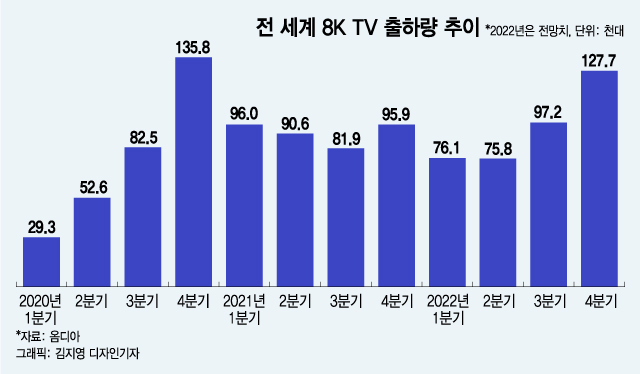 29일 글로벌 시장조사업체 옴디아가 최근 발간한 보고서에 따르면 지난해 하반기 전 세계 시장에 출하된 8K TV는 17만7800대 수준으로 전년 동기 대비 20% 가량 줄었다. 8K TV 출하량은 지난해 3분기 들어 처음으로 감소세를 보였다. 블랙프라이데이 등 연말 할인이 집중되는 4분기에도 출하량에 10만대에 미치지 못했다. 작년 4분기 출하량은 9만5000대 수준으로 전년 대비 30%나 줄었다.
