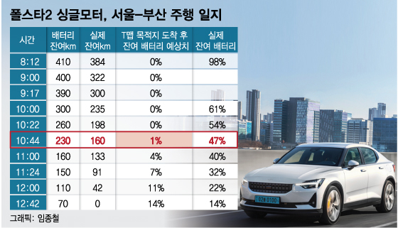 지난달 25일 전국적으로 많은 비가 예보됐던 날에 충전 없이 서울에서 부산으로 이동할 수 있는지 알아보기 위해 직접 주행해봤다. 기자가 탑승했던 차는 폴스타2 롱레인지 싱글모터 트림으로 환경부 인증 최대 주행가능거리는 417㎞다. 150kW까지 급속 충전도 지원하는데, 전국 전기차 충전 인프라도 장거리 주행에 충분한지 확인했다.