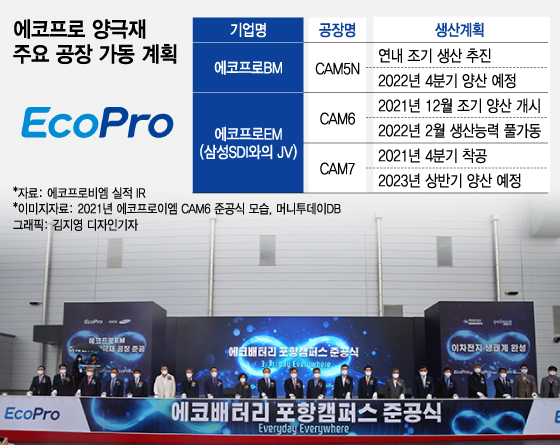 또 삼성SDI와 합작해 만든 에코프로이엠의 CAM6 공장은 지난해 12월 조기 양산을 시작해 현재 연 3만6000톤 규모로 풀가동중이다. 또 에코프로이엠의 CAM7 공장은 2023년 상반기 중 양산 예정이다.