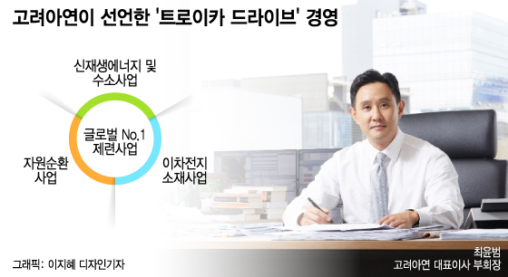 실제 고려아연은 올초 신년사를 통해 '신재생 에너지 및 그린수소' '폐기물 리사이클링(재활용)' '이차전지 소재 산업' 등 세 분야를 신성장동력으로 삼아 성장해 나가겠다는 '트로이카 드라이브'(Troika Drive) 경영을 선포했다.