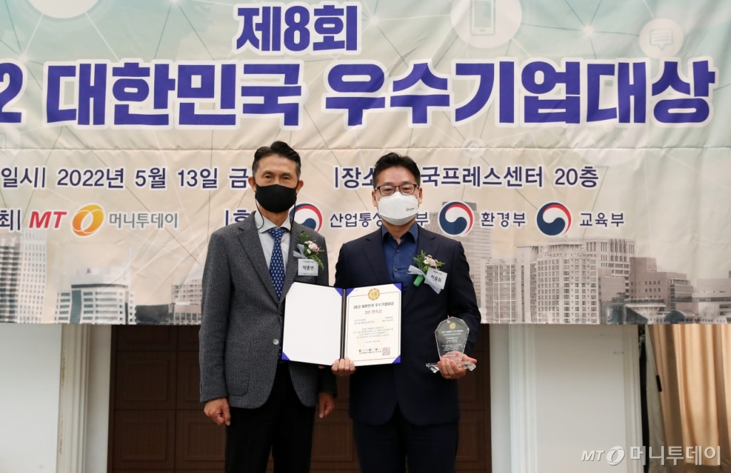 최윤화 제엠제코 대표 (사진 오른쪽)가 13일 오후 서울 중구 한국프레스센터에서 열린 머니투데이 주최의 '2022 제8회 대한민국 우수기업대상' 시상식에서 '3년 연속상'으로 '전기차 파워반도체' 부문 '우수기술대상'을 받고 박종면 머니투데이 대표와 기념 촬영 중이다.